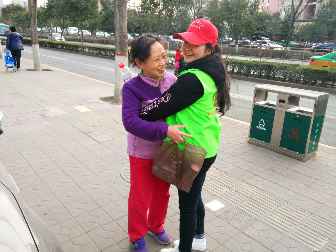 在“学雷锋”主题教育月的背景下,志愿者中队的同学们决定用拥抱的方式将爱和友善传递给身边的人。他们面带微笑,向过路的陌生人介绍自己并送上祝福,在争取到对方的同意后,给予对方真诚的拥抱。此时又恰逢三·八妇女节,志愿者们也为每一位路过的女性送上诚挚的祝福,大家都被志愿者们的热情与真挚所感动。一份看似简单的拥抱,不仅传递了人与人之间的友爱与关怀,更温暖了每个人的心。