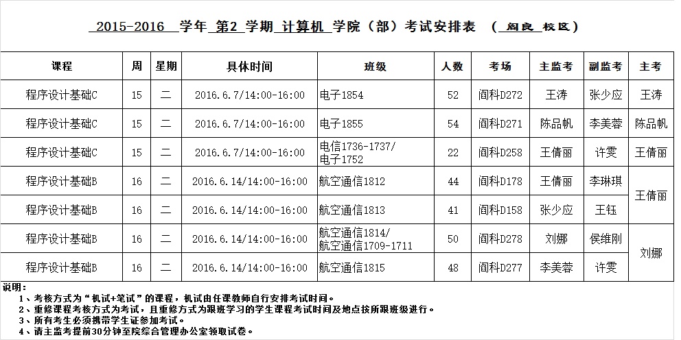 BV伟德官方网站2015-2016-2学期考试安排(阎良校区)