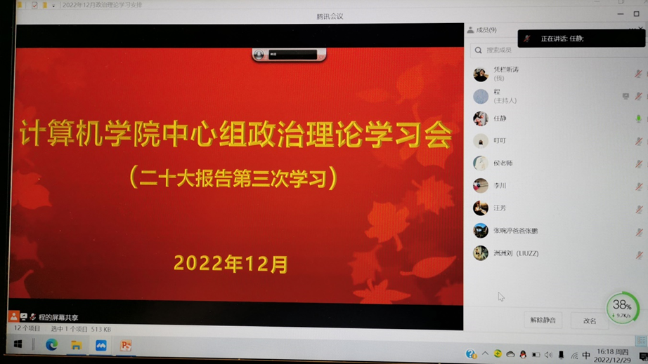随后,汪芳、李川和侯勇等三位中心组成员带领大家原原本本学习了二十大报告的第六部分“发展全过程人民民主,保障人民当家作主”、第七部分“坚持全面依法治国,推进法治中国建设”和第八部分“推进文化自信自强,铸就社会主义文化新辉煌”。任静结合工作实际交流了学习二十大精神的体会。在集体研讨时,大家一直认为习近平总书记在党的二十大报告中对发展全过程人民民主、全面依法治国和推进文化自信自强做出了明确部署,作为高校教育工作者,就是要在新时代新征程上,把这些部署具体、现实地体现到为党育人、为国育才的实践中来,具体、现实地体现到每个人每个方面的工作上来,为实现第二个百年奋斗目标、实现中华民族伟大复兴贡献力量。